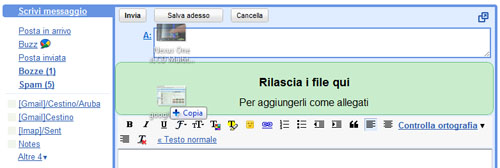 Questa volta gli sviluppatori si sono concentrati sulla fase di upload e download degli allegati. Se precedentemente per inserire un allegato in una e-mail doveva sfogliare le varie cartelle del nostro PC, adesso possiamo velocizzare questa fase attraverso l’introduzione della funzione drag & drop. Basterà infatti selezionare l’allegato da inserire nell’ e-mail, trascinarlo nella pagina web di GMail ed il gioco è fatto!