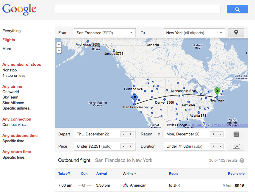 Google non ci dà un attimo di tregua. Dopo la nascita del recente Google Plus (argomento che abbiamo approfondito qualche giorno fa in questo articolo), una delle ultime piattaforme introdotte dalla casa di Mountain View, è il momento di Flights, nuovissimo servizio lanciato solo da pochi giorni. A cosa serve? Crediamo che il nome dica già tutto, ma andiamo ad analizzarne nello specifico funzionalità e le caratteristiche.La struttura di Google Flights si presenta fin da subito essenziale, intuitiva e user-friendly: basta accedere al servizio per notare una pagina impostata in modo ordinato e semplice. Al centro troveremo una mappa, sulla quale è possibile cliccare per impostare facilmente il luogo di arrivo; mentre tutto intorno vedremo vari campi bianchi da completare. In alto c’è la selezione per aeroporto di partenza e di arrivo (per ora disponibili solo aeroporti negli States), selezionabili anche scorrendo e cliccando sulla mappa, mentre in basso è possibile impostare le varie opzioni relative a prezzo, durata e date di viaggio.